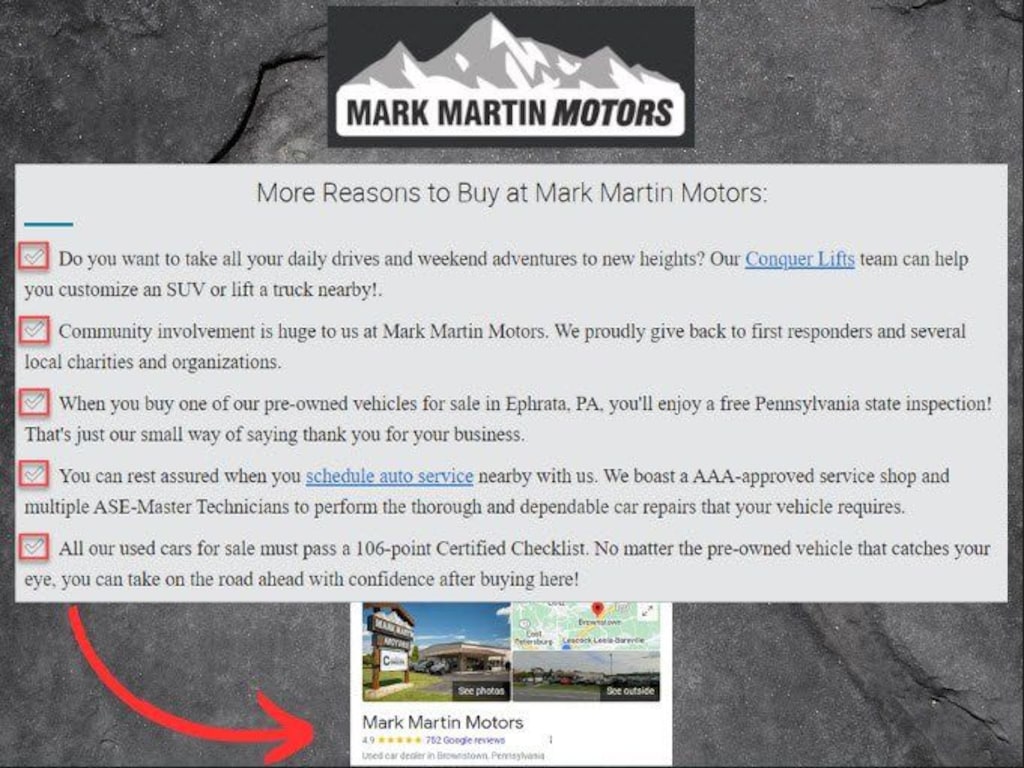 NO HAGGLE PRICING - 106 POINT CERTIFIED INSPECTION FINANCING AVAILABLE NATIONWIDE - WE WELCOME YOUR TRADES NO PRICING GAMES WITH HIDDEN FEES! CALL US FOR YOUR OUT THE DOOR PRICE. Call Us Today @ 717-664-2222! We are located in Lancaster PA near Harrisburg and Philadelphia. Disclaimer: We do our best to make sure this information is accurate; however, we are not responsible for any errors or omissions contained on these pages. Please verify any information in question with Mark Martin Motors.
